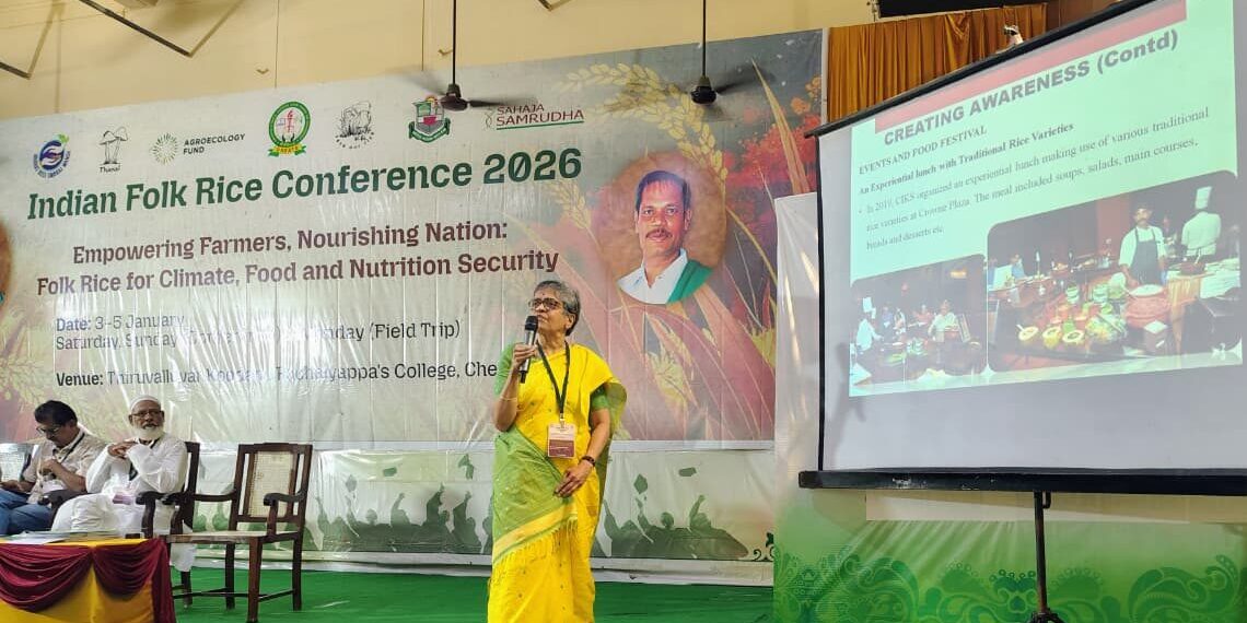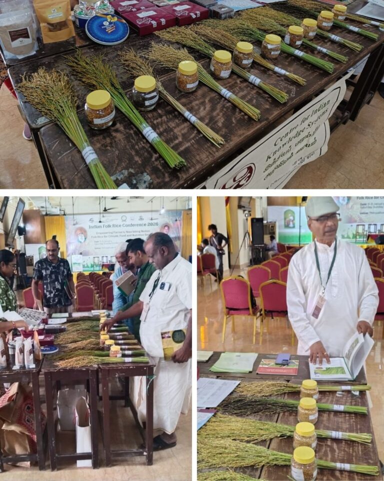 On January 3, 2026, the CIKS team participated in the Indian Folk Rice Conference 2026. The event was organised by CREATE at Pachaiyappa’s College, Chennai. It brought together folk rice custodians, farmers, researchers, policymakers, and civil society organizations from nationwide. Participants advanced conservation, seed sovereignty, and resilient food systems through dynamic knowledge exchange and collaboration. The CIKS team showcased an impressive array of conserved traditional rice varieties, diverse paddy ear heads, and the CIKS Compendium of Traditional Rice Varieties publication via a captivating exhibition display.