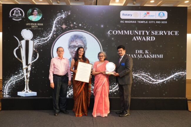 Our Research Director, Dr. K. Vijayalakshmi, was given an award by the Rotary Club of Madras Temple City on 3rd March 2025 at the Trident Hotel. The chief guest for this function was PDG RTN. Pearl Ijeoma Okoro, Trustee of “The Rotary Foundation” (2024-28). The award was presented by Rotarian RTN. Mahaveer Bothra, District Governor,…